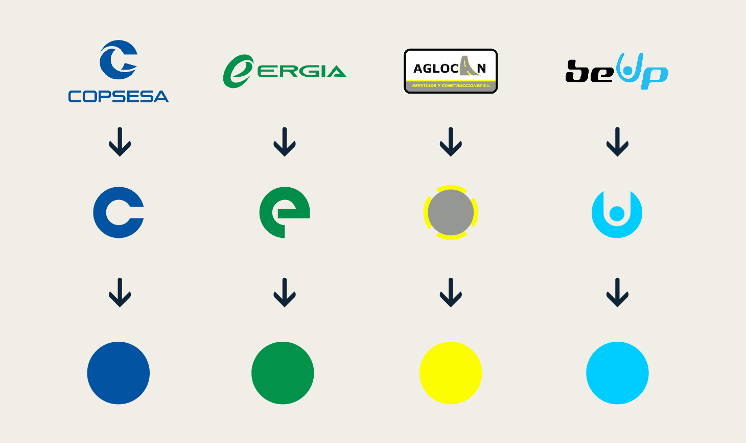 El sistema visual parte de la simplificación de las marcas que forman HSE. De cada una de ellas se extraen sus formas esenciales, que se reducen a elementos gráficos comunes. Esta simplificación permite representar a todas las empresas bajo un mismo lenguaje visual, reforzando la idea de grupo y cohesión.